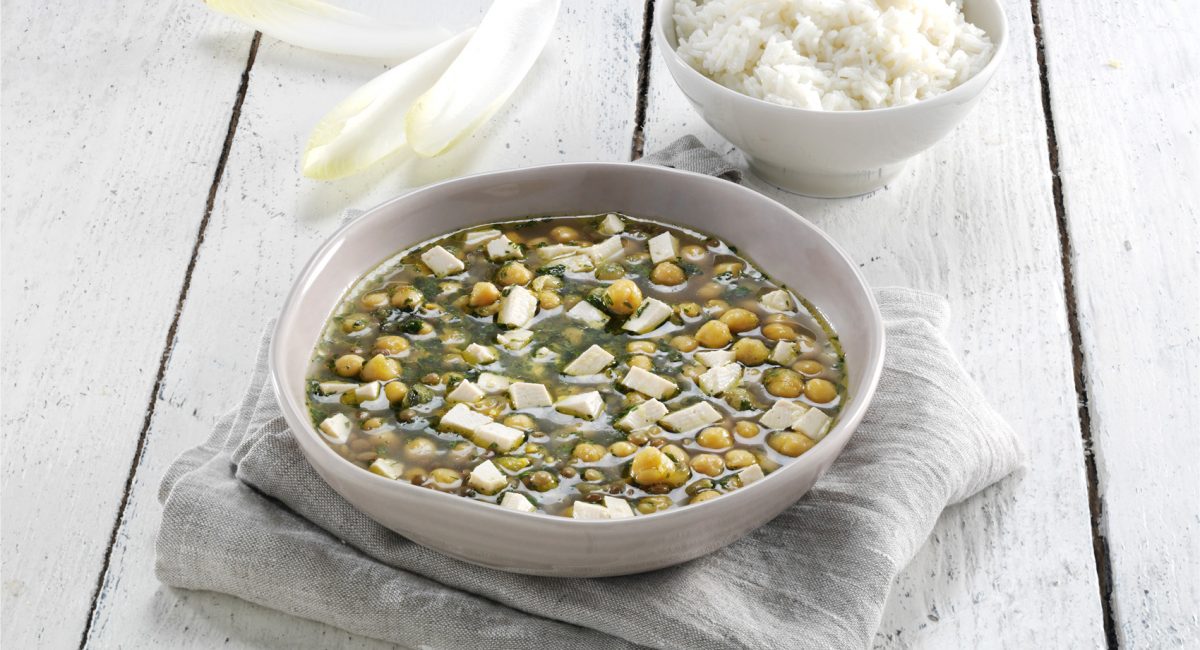 Drain the pulses from the water, remove the kelp and add to the curry. Add 2 ladles of vegetable stock and bring to the boil. Cook on a high flame for 20 minutes. In the meantime, dice the tofu and add to the soup, along with the lemon juice and parsley.