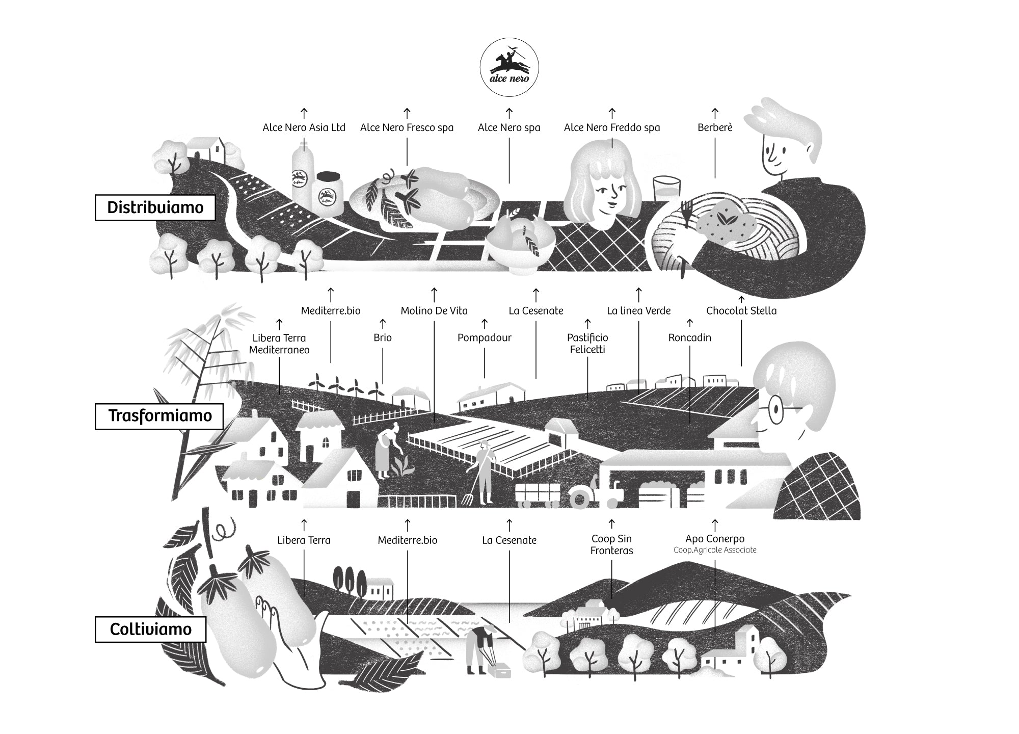 Therefore, ingredients are grown by our farmers and processed by our Shareholders: seven plants in Italy, one in Switzerland, dedicated to the processing of cocoa, and one in Peru dedicated to raw cane sugar. A group firmly rooted in the land, a concrete and distinctive example of an integrated, organised and sustainable network, whose work is symbolised by the Alce Nero brand.